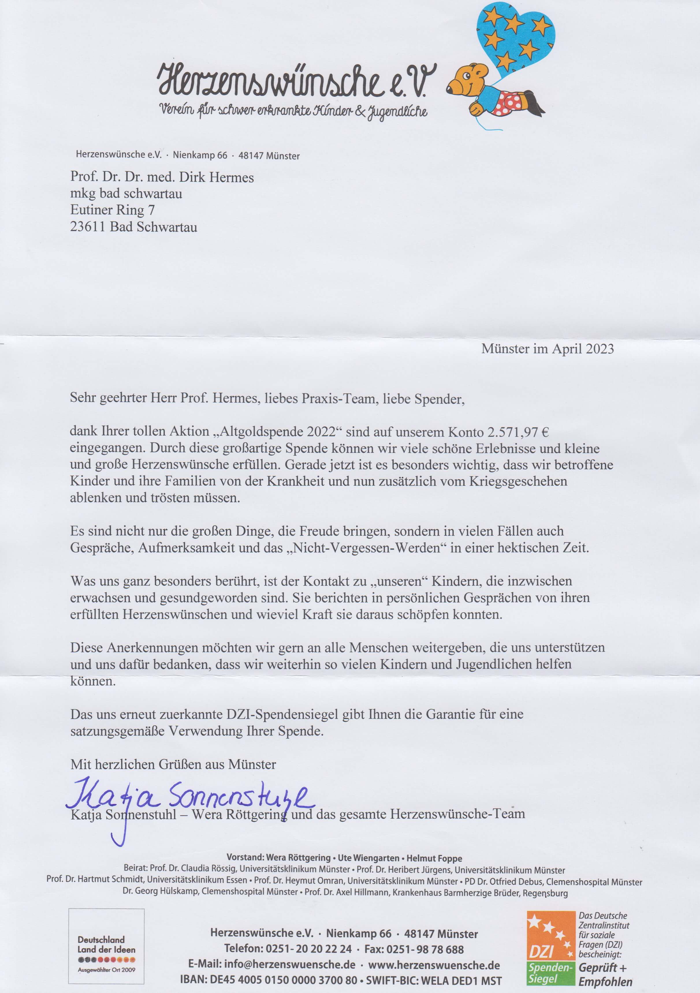 Zwischenzeitlich erreichte uns ein Schreiben von "Herzenswünsche e.V.", welche wir insbesondere unseren lieben Altgold-Spendern nicht vorenthalten möchten (zum Vergrößern bitte anklicken):