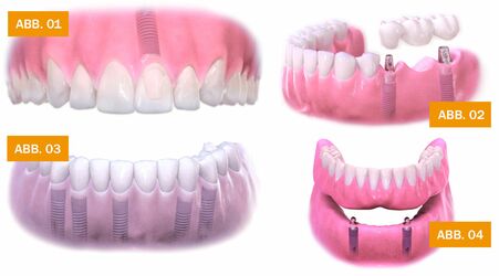 ABB.03: Abgeschlossene Implantatversorgung. Mehrere Implantate und Brücke zum Ersatz vieler Zähne eines Kiefers