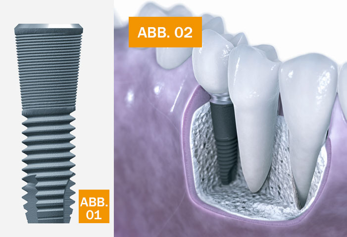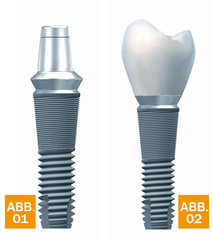 ABB.01: Abgeschlossene Implantatversorgung. Eingebrachtes Implantat und Zahnkrone zum Ersatz eines Einzelzahns