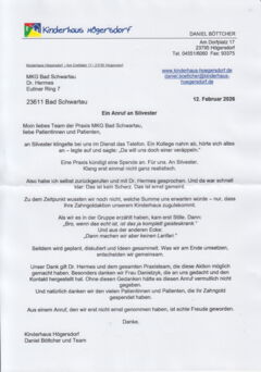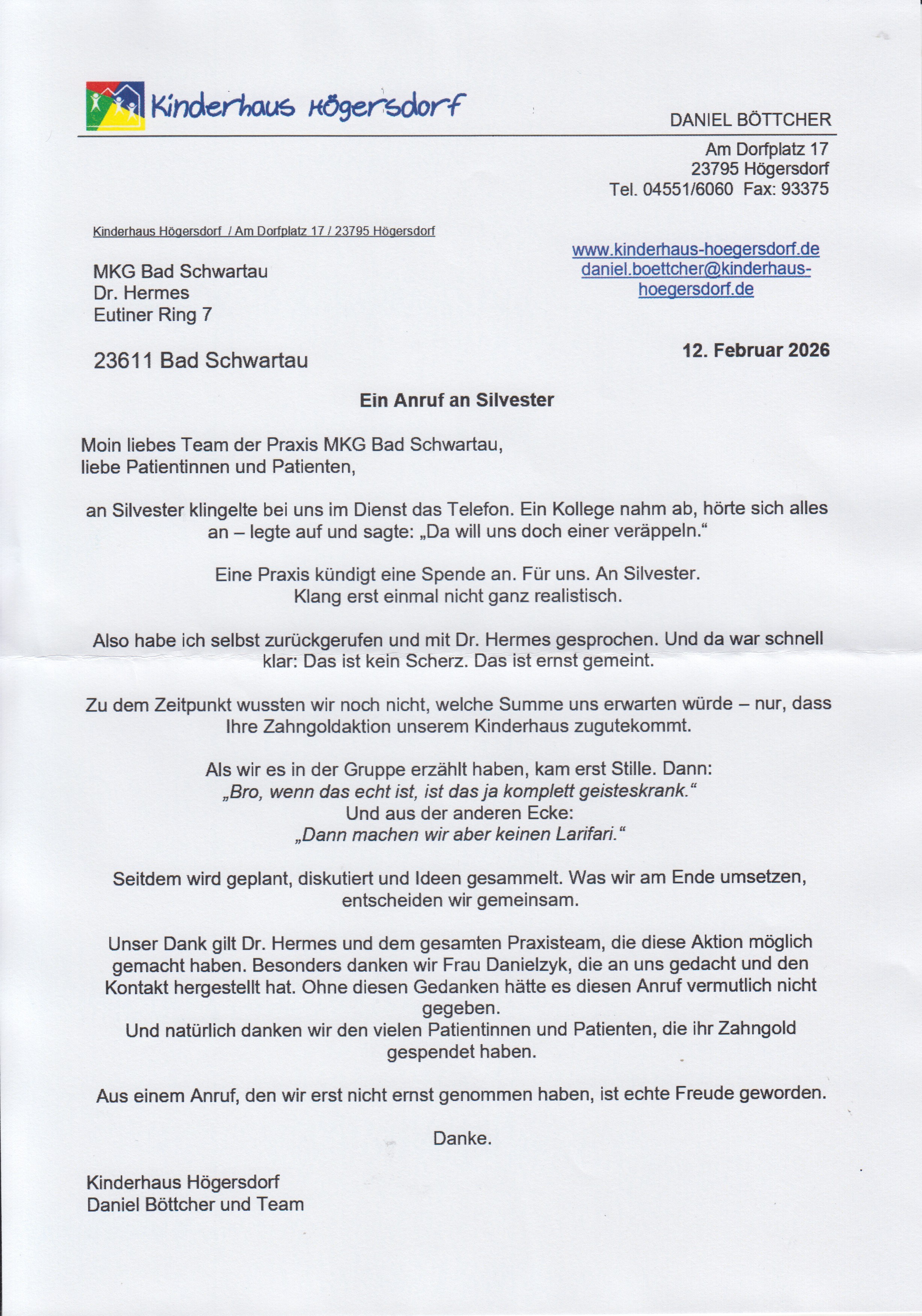 Auch Herr Böttcher und das Team des Kinderhauses Högersdorf haben sich bei uns für die Spende bedankt.